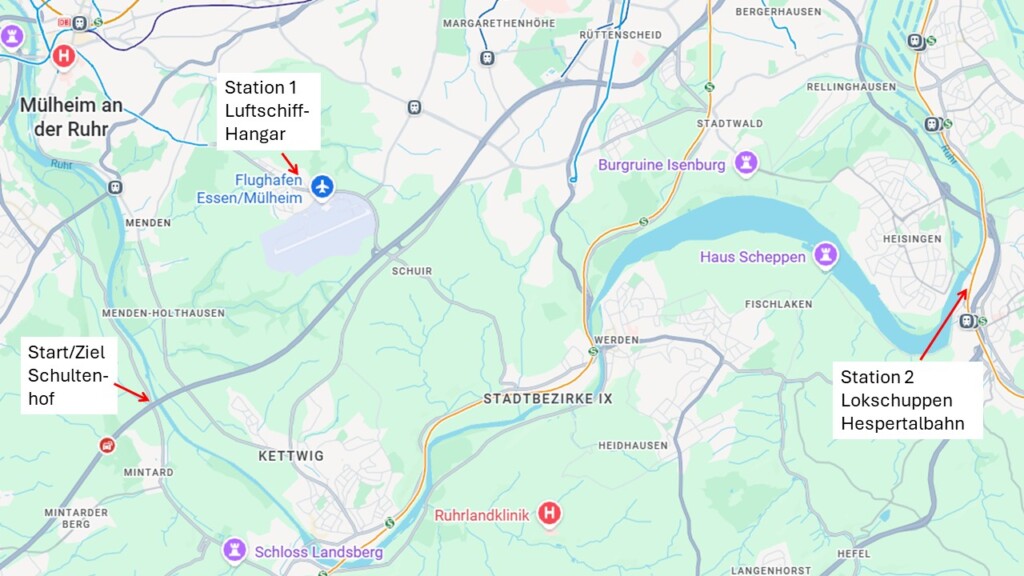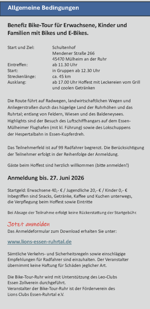 Ab ca. 17 Uhr erfolgt der Ausklang bei einem zünftigen Hoffest mit Leckereien vom Grill und coolen Getränken. Die Route führt auf Radwegen, landwirtschaftlichen Wegen und Anliegerstraßen durch das hügelige Land der Ruhrhöhen und das Ruhrtal; entlang von Feldern, Wiesen und des Baldeneysees. Highlights sind der Besuch des Luftschiffhangars auf dem Essen-Mülheimer Flughafen (mit kleiner Führung) sowie des Lokschuppens der Hespertalbahn in Essen-Kupferdreh. Das Teilnehmerfeld ist auf 99 Radfahrer begrenzt. Die Berücksichtigung der Teilnehmer erfolgt in der Reihenfolge der Anmeldung. Gäste beim Hoffest sind herzlich willkommen (bitte anmelden!)