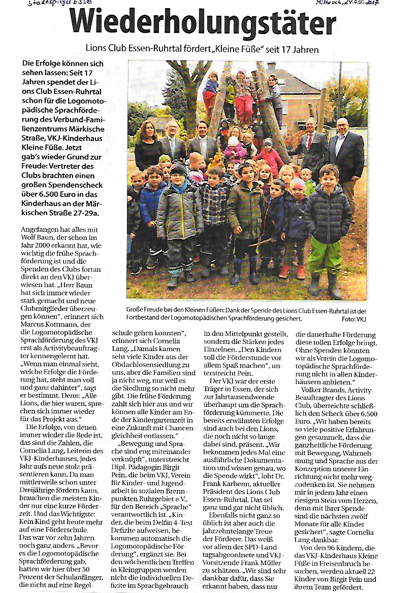 Engagement für „Kleine Füße“ seit 17 Jahren Stadtspiegel v. 24.5.2017 Foto: VKJ aPAY2017-05-30T14:12:13+02:00 Ähnliche Beiträge Photo-Strecke zur Benefiz-Fahrrad-Tour Neuer Lions-Präsident – Mit Leidenschaft und Einsatz die Welt ein Stück besser machen! Patenschaft schlägt Wellen Benefiz-Bike-Tour 2025 Ein Vierteljahrhundert Sprachförderung