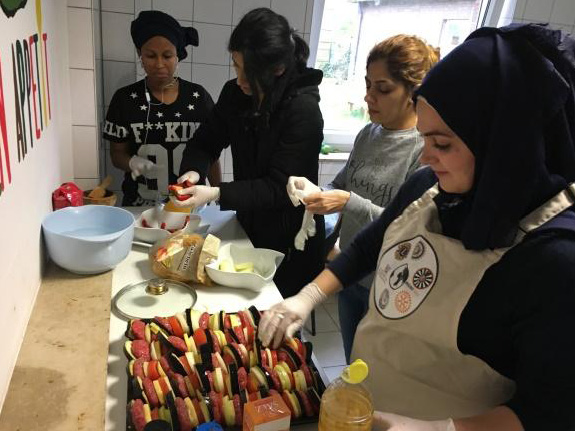 Die Rahmenbedingungen des gemeinsamen Kochens hatten sich insofern geändert, als in der Einrichtung in der Karl-Meyer-Straße inzwischen nur noch alleinstehende Frauen oder solche mit Kindern untergebracht sind. Beim ersten gemeinsamen Kochen waren in der Einrichtung noch Familien untergebracht und die Frauen mit und ohne Kinder in der Flüchtlingsunterkunft in der Buschstraße, die aber inzwischen geschlossen wurde. Auf diese Veränderung waren die Lions vorbereitet. Überrascht wurden sie davon, dass aus den angekündigten Nigerianerinnen, mit denen gekocht werden sollte, eine bunte Mischung unterschiedlichster Nationalitäten wurde. Dem Vergnügen am gemeinsamen Vor- und Zubereiten der Speisen tat dies aber keinen Abbruch.